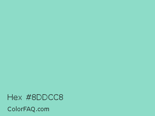 Hex #8ddcc8 Color is a light cyan color and the nearest color is Middle Blue Green #8dd9cc. Hex code #8ddcc8 and RGB value is rgb(141,220,200). In RGB color space, this color is composed of 55% red, 86% green, 78% blue, In CMYK color space, this color is composed of 36% cyan, 0% magenta, 9% yellow , 14% black , In HSL color space, this color has a hue angle of 165° , 53% saturation and 71% lightness.