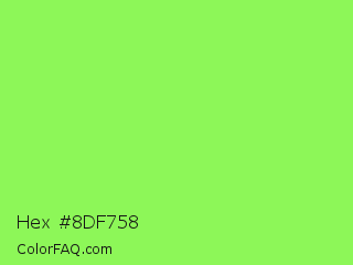 Hex #8df758 Color is a light green color and the nearest color is Kiwi #8ee53f. Hex code #8df758 and RGB value is rgb(141,247,88). In RGB color space, this color is composed of 55% red, 97% green, 35% blue, In CMYK color space, this color is composed of 43% cyan, 0% magenta, 64% yellow , 3% black , In HSL color space, this color has a hue angle of 100° , 91% saturation and 66% lightness.