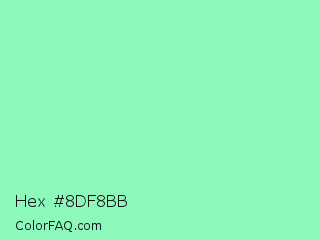 Hex #8df8bb Color is a light green color and the nearest color is Teal Deer #99e6b3. Hex code #8df8bb and RGB value is rgb(141,248,187). In RGB color space, this color is composed of 55% red, 97% green, 73% blue, In CMYK color space, this color is composed of 43% cyan, 0% magenta, 25% yellow , 3% black , In HSL color space, this color has a hue angle of 146° , 88% saturation and 76% lightness.