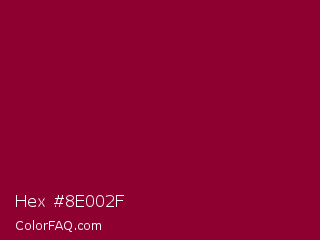 Hex #8e002f Color is a dark rose color and the nearest color is Paprika #8d0226. Hex code #8e002f and RGB value is rgb(142,0,47). In RGB color space, this color is composed of 56% red, 0% green, 18% blue, In CMYK color space, this color is composed of 0% cyan, 100% magenta, 67% yellow , 44% black , In HSL color space, this color has a hue angle of 340° , 100% saturation and 28% lightness.