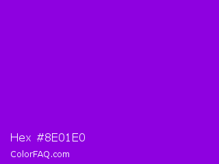 Hex #8e01e0 Color is a normal purple color and the nearest color is Dark Violet #9400d3. Hex code #8e01e0 and RGB value is rgb(142,1,224). In RGB color space, this color is composed of 56% red, 0% green, 88% blue, In CMYK color space, this color is composed of 37% cyan, 100% magenta, 0% yellow , 12% black , In HSL color space, this color has a hue angle of 278° , 99% saturation and 44% lightness.