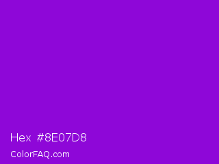 Hex #8e07d8 Color is a normal purple color and the nearest color is Dark Violet #9400d3. Hex code #8e07d8 and RGB value is rgb(142,7,216). In RGB color space, this color is composed of 56% red, 3% green, 85% blue, In CMYK color space, this color is composed of 34% cyan, 97% magenta, 0% yellow , 15% black , In HSL color space, this color has a hue angle of 279° , 94% saturation and 44% lightness.