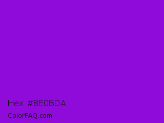 Hex #8e0bda Color is a normal purple color and the nearest color is French Violet #8806ce. Hex code #8e0bda and RGB value is rgb(142,11,218). In RGB color space, this color is composed of 56% red, 4% green, 85% blue, In CMYK color space, this color is composed of 35% cyan, 95% magenta, 0% yellow , 15% black , In HSL color space, this color has a hue angle of 278° , 90% saturation and 45% lightness.