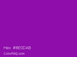 Hex #8e0dab Color is a normal purple color and the nearest color is Violet RYB #8601af. Hex code #8e0dab and RGB value is rgb(142,13,171). In RGB color space, this color is composed of 56% red, 5% green, 67% blue, In CMYK color space, this color is composed of 17% cyan, 92% magenta, 0% yellow , 33% black , In HSL color space, this color has a hue angle of 289° , 86% saturation and 36% lightness.
