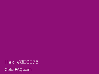 Hex #8e0e76 Color is a normal magenta color and the nearest color is Mardi Gras #880085. Hex code #8e0e76 and RGB value is rgb(142,14,118). In RGB color space, this color is composed of 56% red, 5% green, 46% blue, In CMYK color space, this color is composed of 0% cyan, 90% magenta, 17% yellow , 44% black , In HSL color space, this color has a hue angle of 311° , 82% saturation and 31% lightness.