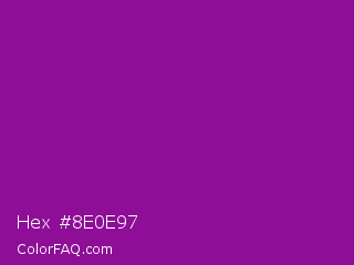 Hex #8e0e97 Color is a normal magenta color and the nearest color is Violet Eggplant #991199. Hex code #8e0e97 and RGB value is rgb(142,14,151). In RGB color space, this color is composed of 56% red, 5% green, 59% blue, In CMYK color space, this color is composed of 6% cyan, 91% magenta, 0% yellow , 41% black , In HSL color space, this color has a hue angle of 296° , 83% saturation and 32% lightness.
