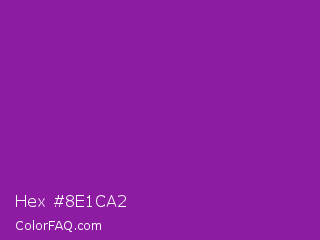 Hex #8e1ca2 Color is a normal purple color and the nearest color is Violet Eggplant #991199. Hex code #8e1ca2 and RGB value is rgb(142,28,162). In RGB color space, this color is composed of 56% red, 11% green, 64% blue, In CMYK color space, this color is composed of 12% cyan, 83% magenta, 0% yellow , 36% black , In HSL color space, this color has a hue angle of 291° , 71% saturation and 37% lightness.