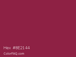 Hex #8e2144 Color is a normal rose color and the nearest color is Big Dip O Ruby #9c2542. Hex code #8e2144 and RGB value is rgb(142,33,68). In RGB color space, this color is composed of 56% red, 13% green, 27% blue, In CMYK color space, this color is composed of 0% cyan, 77% magenta, 52% yellow , 44% black , In HSL color space, this color has a hue angle of 341° , 62% saturation and 34% lightness.