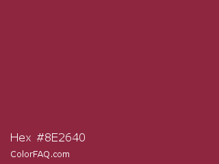 Hex #8e2640 Color is a normal red color and the nearest color is Big Dip O Ruby #9c2542. Hex code #8e2640 and RGB value is rgb(142,38,64). In RGB color space, this color is composed of 56% red, 15% green, 25% blue, In CMYK color space, this color is composed of 0% cyan, 73% magenta, 55% yellow , 44% black , In HSL color space, this color has a hue angle of 345° , 58% saturation and 35% lightness.