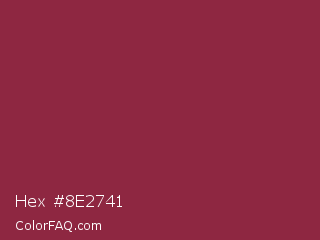 Hex #8e2741 Color is a normal red color and the nearest color is Big Dip O Ruby #9c2542. Hex code #8e2741 and RGB value is rgb(142,39,65). In RGB color space, this color is composed of 56% red, 15% green, 25% blue, In CMYK color space, this color is composed of 0% cyan, 73% magenta, 54% yellow , 44% black , In HSL color space, this color has a hue angle of 345° , 57% saturation and 35% lightness.
