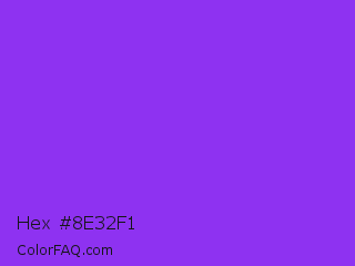 Hex #8e32f1 Color is a normal violet color and the nearest color is Blue Violet #8a2be2. Hex code #8e32f1 and RGB value is rgb(142,50,241). In RGB color space, this color is composed of 56% red, 20% green, 95% blue, In CMYK color space, this color is composed of 41% cyan, 79% magenta, 0% yellow , 5% black , In HSL color space, this color has a hue angle of 269° , 87% saturation and 57% lightness.