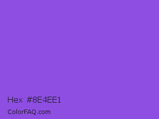 Hex #8e4ee1 Color is a normal violet color and the nearest color is Navy Purple #9457eb. Hex code #8e4ee1 and RGB value is rgb(142,78,225). In RGB color space, this color is composed of 56% red, 31% green, 88% blue, In CMYK color space, this color is composed of 37% cyan, 65% magenta, 0% yellow , 12% black , In HSL color space, this color has a hue angle of 266° , 71% saturation and 59% lightness.