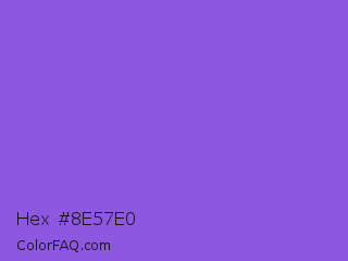 Hex #8e57e0 Color is a light violet color and the nearest color is Navy Purple #9457eb. Hex code #8e57e0 and RGB value is rgb(142,87,224). In RGB color space, this color is composed of 56% red, 34% green, 88% blue, In CMYK color space, this color is composed of 37% cyan, 61% magenta, 0% yellow , 12% black , In HSL color space, this color has a hue angle of 264° , 69% saturation and 61% lightness.