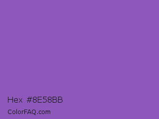 Hex #8e58bb Color is a normal purple color and the nearest color is Deep Lilac #9955bb. Hex code #8e58bb and RGB value is rgb(142,88,187). In RGB color space, this color is composed of 56% red, 35% green, 73% blue, In CMYK color space, this color is composed of 24% cyan, 53% magenta, 0% yellow , 27% black , In HSL color space, this color has a hue angle of 273° , 42% saturation and 54% lightness.
