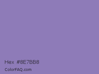 Hex #8e7bb8 Color is a normal indigo color and the nearest color is Lavender Purple #967bb6. Hex code #8e7bb8 and RGB value is rgb(142,123,184). In RGB color space, this color is composed of 56% red, 48% green, 72% blue, In CMYK color space, this color is composed of 23% cyan, 33% magenta, 0% yellow , 28% black , In HSL color space, this color has a hue angle of 259° , 30% saturation and 60% lightness.