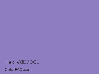 Hex #8e7dc1 Color is a light indigo color and the nearest color is Ube #8878c3. Hex code #8e7dc1 and RGB value is rgb(142,125,193). In RGB color space, this color is composed of 56% red, 49% green, 76% blue, In CMYK color space, this color is composed of 26% cyan, 35% magenta, 0% yellow , 24% black , In HSL color space, this color has a hue angle of 255° , 35% saturation and 62% lightness.