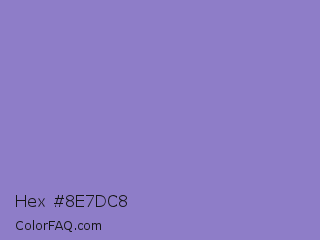 Hex #8e7dc8 Color is a light indigo color and the nearest color is Ube #8878c3. Hex code #8e7dc8 and RGB value is rgb(142,125,200). In RGB color space, this color is composed of 56% red, 49% green, 78% blue, In CMYK color space, this color is composed of 29% cyan, 38% magenta, 0% yellow , 22% black , In HSL color space, this color has a hue angle of 254° , 41% saturation and 64% lightness.