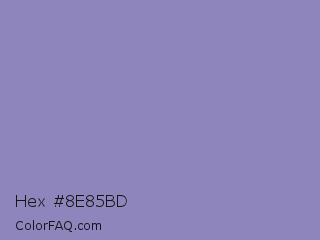 Hex #8e85bd Color is a light indigo color and the nearest color is Lavender Purple #967bb6. Hex code #8e85bd and RGB value is rgb(142,133,189). In RGB color space, this color is composed of 56% red, 52% green, 74% blue, In CMYK color space, this color is composed of 25% cyan, 30% magenta, 0% yellow , 26% black , In HSL color space, this color has a hue angle of 250° , 30% saturation and 63% lightness.