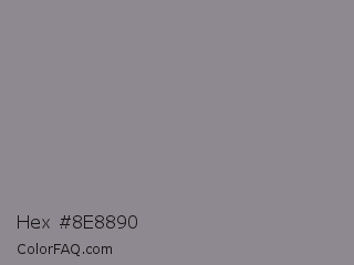 Hex #8e8890 Color is a normal purple color and the nearest color is Venus #928590. Hex code #8e8890 and RGB value is rgb(142,136,144). In RGB color space, this color is composed of 56% red, 53% green, 56% blue, In CMYK color space, this color is composed of 1% cyan, 6% magenta, 0% yellow , 44% black , In HSL color space, this color has a hue angle of 285° , 3% saturation and 55% lightness.