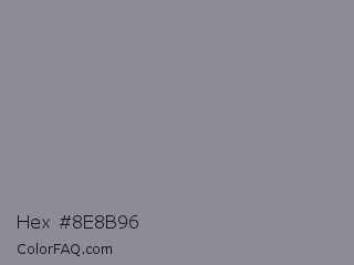 Hex #8e8b96 Color is a normal indigo color and the nearest color is Oslo Gray #878d91. Hex code #8e8b96 and RGB value is rgb(142,139,150). In RGB color space, this color is composed of 56% red, 55% green, 59% blue, In CMYK color space, this color is composed of 5% cyan, 7% magenta, 0% yellow , 41% black , In HSL color space, this color has a hue angle of 256° , 5% saturation and 57% lightness.