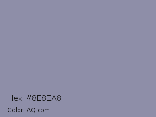 Hex #8e8ea8 Color is a light blue color and the nearest color is Cool Grey #8c92ac. Hex code #8e8ea8 and RGB value is rgb(142,142,168). In RGB color space, this color is composed of 56% red, 56% green, 66% blue, In CMYK color space, this color is composed of 15% cyan, 15% magenta, 0% yellow , 34% black , In HSL color space, this color has a hue angle of 240° , 13% saturation and 61% lightness.