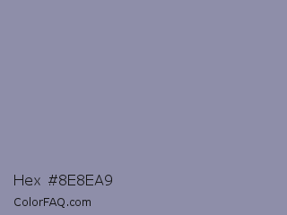 Hex #8e8ea9 Color is a light blue color and the nearest color is Cool Grey #8c92ac. Hex code #8e8ea9 and RGB value is rgb(142,142,169). In RGB color space, this color is composed of 56% red, 56% green, 66% blue, In CMYK color space, this color is composed of 16% cyan, 16% magenta, 0% yellow , 34% black , In HSL color space, this color has a hue angle of 240° , 14% saturation and 61% lightness.