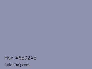 Hex #8e92ae Color is a light blue color and the nearest color is Cool Grey #8c92ac. Hex code #8e92ae and RGB value is rgb(142,146,174). In RGB color space, this color is composed of 56% red, 57% green, 68% blue, In CMYK color space, this color is composed of 18% cyan, 16% magenta, 0% yellow , 32% black , In HSL color space, this color has a hue angle of 233° , 16% saturation and 62% lightness.