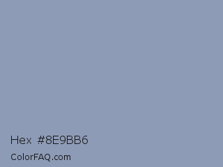 Hex #8e9bb6 Color is a light blue color and the nearest color is Cadet Grey #91a3b0. Hex code #8e9bb6 and RGB value is rgb(142,155,182). In RGB color space, this color is composed of 56% red, 61% green, 71% blue, In CMYK color space, this color is composed of 22% cyan, 15% magenta, 0% yellow , 29% black , In HSL color space, this color has a hue angle of 221° , 22% saturation and 64% lightness.
