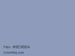 Hex #8e9bba Color is a light blue color and the nearest color is Cadet Grey #91a3b0. Hex code #8e9bba and RGB value is rgb(142,155,186). In RGB color space, this color is composed of 56% red, 61% green, 73% blue, In CMYK color space, this color is composed of 24% cyan, 17% magenta, 0% yellow , 27% black , In HSL color space, this color has a hue angle of 222° , 24% saturation and 64% lightness.