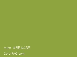 Hex #8ea43e Color is a normal lime color and the nearest color is Sushi #87ab39. Hex code #8ea43e and RGB value is rgb(142,164,62). In RGB color space, this color is composed of 56% red, 64% green, 24% blue, In CMYK color space, this color is composed of 13% cyan, 0% magenta, 62% yellow , 36% black , In HSL color space, this color has a hue angle of 73° , 45% saturation and 44% lightness.