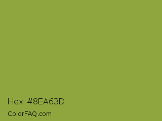 Hex #8ea63d Color is a normal lime color and the nearest color is Sushi #87ab39. Hex code #8ea63d and RGB value is rgb(142,166,61). In RGB color space, this color is composed of 56% red, 65% green, 24% blue, In CMYK color space, this color is composed of 14% cyan, 0% magenta, 63% yellow , 35% black , In HSL color space, this color has a hue angle of 74° , 46% saturation and 45% lightness.