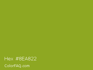 Hex #8ea822 Color is a normal lime color and the nearest color is Citron #9fa91f. Hex code #8ea822 and RGB value is rgb(142,168,34). In RGB color space, this color is composed of 56% red, 66% green, 13% blue, In CMYK color space, this color is composed of 15% cyan, 0% magenta, 80% yellow , 34% black , In HSL color space, this color has a hue angle of 72° , 66% saturation and 40% lightness.