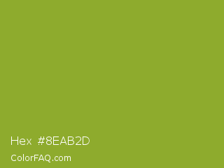 Hex #8eab2d Color is a normal lime color and the nearest color is Sushi #87ab39. Hex code #8eab2d and RGB value is rgb(142,171,45). In RGB color space, this color is composed of 56% red, 67% green, 18% blue, In CMYK color space, this color is composed of 17% cyan, 0% magenta, 74% yellow , 33% black , In HSL color space, this color has a hue angle of 74° , 58% saturation and 42% lightness.