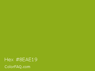 Hex #8eae19 Color is a normal lime color and the nearest color is Citron #9fa91f. Hex code #8eae19 and RGB value is rgb(142,174,25). In RGB color space, this color is composed of 56% red, 68% green, 10% blue, In CMYK color space, this color is composed of 18% cyan, 0% magenta, 86% yellow , 32% black , In HSL color space, this color has a hue angle of 73° , 75% saturation and 39% lightness.