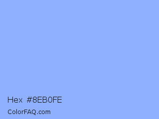 Hex #8eb0fe Color is a light blue color and the nearest color is Jordy Blue #8ab9f1. Hex code #8eb0fe and RGB value is rgb(142,176,254). In RGB color space, this color is composed of 56% red, 69% green, 100% blue, In CMYK color space, this color is composed of 44% cyan, 31% magenta, 0% yellow , 0% black , In HSL color space, this color has a hue angle of 222° , 98% saturation and 78% lightness.