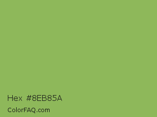 Hex #8eb85a Color is a normal green color and the nearest color is Dollar Bill #85bb65. Hex code #8eb85a and RGB value is rgb(142,184,90). In RGB color space, this color is composed of 56% red, 72% green, 35% blue, In CMYK color space, this color is composed of 23% cyan, 0% magenta, 51% yellow , 28% black , In HSL color space, this color has a hue angle of 87° , 40% saturation and 54% lightness.
