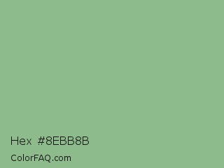 Hex #8ebb8b Color is a light green color and the nearest color is Dark Sea Green #8fbc8f. Hex code #8ebb8b and RGB value is rgb(142,187,139). In RGB color space, this color is composed of 56% red, 73% green, 55% blue, In CMYK color space, this color is composed of 24% cyan, 0% magenta, 26% yellow , 27% black , In HSL color space, this color has a hue angle of 116° , 26% saturation and 64% lightness.