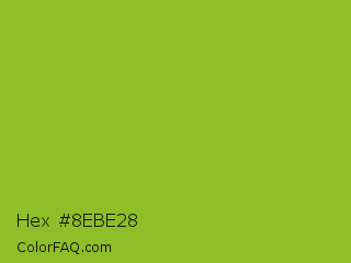 Hex #8ebe28 Color is a normal lime color and the nearest color is Atlantis #97cd2d. Hex code #8ebe28 and RGB value is rgb(142,190,40). In RGB color space, this color is composed of 56% red, 75% green, 16% blue, In CMYK color space, this color is composed of 25% cyan, 0% magenta, 79% yellow , 25% black , In HSL color space, this color has a hue angle of 79° , 65% saturation and 45% lightness.