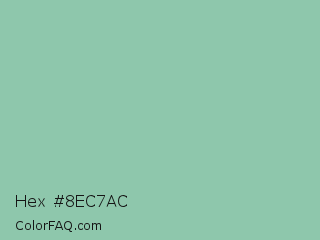 Hex #8ec7ac Color is a light green color and the nearest color is Eton Blue #96c8a2. Hex code #8ec7ac and RGB value is rgb(142,199,172). In RGB color space, this color is composed of 56% red, 78% green, 67% blue, In CMYK color space, this color is composed of 29% cyan, 0% magenta, 14% yellow , 22% black , In HSL color space, this color has a hue angle of 152° , 34% saturation and 67% lightness.