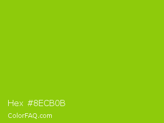 Hex #8ecb0b Color is a normal lime color and the nearest color is Sheen Green #8fd400. Hex code #8ecb0b and RGB value is rgb(142,203,11). In RGB color space, this color is composed of 56% red, 80% green, 4% blue, In CMYK color space, this color is composed of 30% cyan, 0% magenta, 95% yellow , 20% black , In HSL color space, this color has a hue angle of 79° , 90% saturation and 42% lightness.