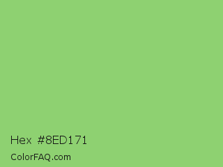 Hex #8ed171 Color is a light green color and the nearest color is Pistachio #93c572. Hex code #8ed171 and RGB value is rgb(142,209,113). In RGB color space, this color is composed of 56% red, 82% green, 44% blue, In CMYK color space, this color is composed of 32% cyan, 0% magenta, 46% yellow , 18% black , In HSL color space, this color has a hue angle of 102° , 51% saturation and 63% lightness.