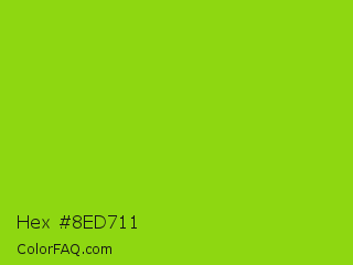 Hex #8ed711 Color is a normal green color and the nearest color is Sheen Green #8fd400. Hex code #8ed711 and RGB value is rgb(142,215,17). In RGB color space, this color is composed of 56% red, 84% green, 7% blue, In CMYK color space, this color is composed of 34% cyan, 0% magenta, 92% yellow , 16% black , In HSL color space, this color has a hue angle of 82° , 85% saturation and 45% lightness.