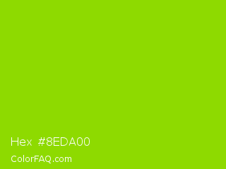 Hex #8eda00 Color is a normal green color and the nearest color is Sheen Green #8fd400. Hex code #8eda00 and RGB value is rgb(142,218,0). In RGB color space, this color is composed of 56% red, 85% green, 0% blue, In CMYK color space, this color is composed of 35% cyan, 0% magenta, 100% yellow , 15% black , In HSL color space, this color has a hue angle of 81° , 100% saturation and 43% lightness.