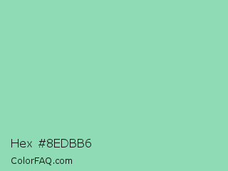 Hex #8edbb6 Color is a light green color and the nearest color is Vista Blue #8fd6b4. Hex code #8edbb6 and RGB value is rgb(142,219,182). In RGB color space, this color is composed of 56% red, 86% green, 71% blue, In CMYK color space, this color is composed of 35% cyan, 0% magenta, 17% yellow , 14% black , In HSL color space, this color has a hue angle of 151° , 52% saturation and 71% lightness.