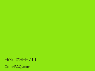 Hex #8ee711 Color is a normal green color and the nearest color is Alien Armpit #84de02. Hex code #8ee711 and RGB value is rgb(142,231,17). In RGB color space, this color is composed of 56% red, 91% green, 7% blue, In CMYK color space, this color is composed of 39% cyan, 0% magenta, 93% yellow , 9% black , In HSL color space, this color has a hue angle of 85° , 86% saturation and 49% lightness.