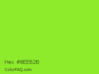 Hex #8eeb2b Color is a normal green color and the nearest color is Kiwi #8ee53f. Hex code #8eeb2b and RGB value is rgb(142,235,43). In RGB color space, this color is composed of 56% red, 92% green, 17% blue, In CMYK color space, this color is composed of 40% cyan, 0% magenta, 82% yellow , 8% black , In HSL color space, this color has a hue angle of 89° , 83% saturation and 55% lightness.