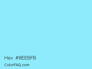 Hex #8eebfb Color is a light cyan color and the nearest color is Anakiwa #9de5ff. Hex code #8eebfb and RGB value is rgb(142,235,251). In RGB color space, this color is composed of 56% red, 92% green, 98% blue, In CMYK color space, this color is composed of 43% cyan, 6% magenta, 0% yellow , 2% black , In HSL color space, this color has a hue angle of 189° , 93% saturation and 77% lightness.