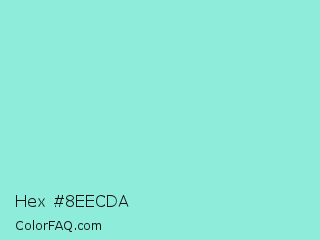 Hex #8eecda Color is a light cyan color and the nearest color is Riptide #8be6d8. Hex code #8eecda and RGB value is rgb(142,236,218). In RGB color space, this color is composed of 56% red, 93% green, 85% blue, In CMYK color space, this color is composed of 40% cyan, 0% magenta, 8% yellow , 7% black , In HSL color space, this color has a hue angle of 169° , 71% saturation and 74% lightness.