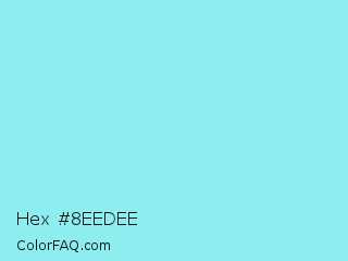 Hex #8eedee Color is a light cyan color and the nearest color is Blizzard Blue Crayola #a3e3ed. Hex code #8eedee and RGB value is rgb(142,237,238). In RGB color space, this color is composed of 56% red, 93% green, 93% blue, In CMYK color space, this color is composed of 40% cyan, 0% magenta, 0% yellow , 7% black , In HSL color space, this color has a hue angle of 181° , 74% saturation and 75% lightness.
