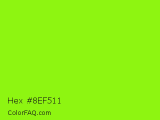 Hex #8ef511 Color is a normal green color and the nearest color is Chartreuse #7fff00. Hex code #8ef511 and RGB value is rgb(142,245,17). In RGB color space, this color is composed of 56% red, 96% green, 7% blue, In CMYK color space, this color is composed of 42% cyan, 0% magenta, 93% yellow , 4% black , In HSL color space, this color has a hue angle of 87° , 92% saturation and 51% lightness.